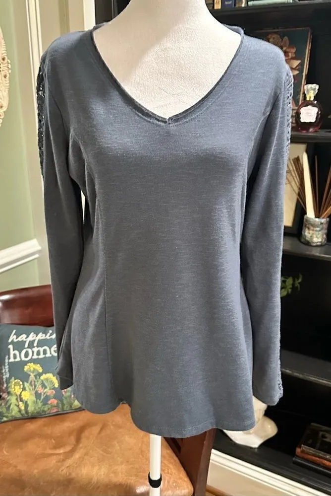 North River Blue Long Sleeve Peplum T-Shirt Size Small This North River Blue Long Sleeve Peplum T-shirt size Small is in such good condition you may mistake it for brand new. No flaws or signs of wear. See photo for material content Peplums out Figure flattering Crotchet sleeves Size Small Measurements approximate taken flat lay Bust: 38” Length: 25.5”
