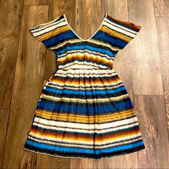 Nice blue white brown and black striped shirt sleeve casual knee length dress. Attached white cami /... Show more