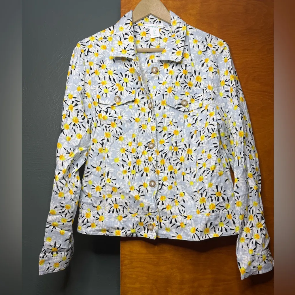 Authentic Cynthia Rowley button-front denim jacket featuring an allover embroidered daisy floral des... Show more