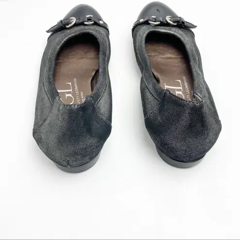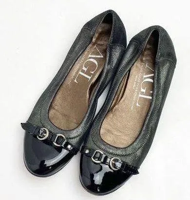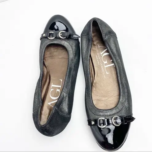 Attilio Giusti Leombruni black patent leather round toe ballet flats made in Italy. Showing minimal... Show more