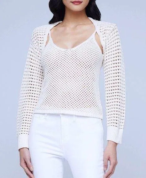 L’Agence Sammy Ivory Crochet Tank and Shawl Size: XS Color: Ivory Condition: New, without tags. A lovely crocheted top in neutral ecru. Soft, luxe knit features slim-fit scoopneck tank with attached shrug meant to be worn on or off the shoulder. Meticulous openwork crochet in two complementary patterns to enhance the twin-set look. Sleek long sleeves. 60% Cotton 40% Polyester Cruise wear, nautical, tropical, bright, vacation, travel, vacay, summer, swim, resort wear, Prairie, boho, bohemian, cottagecore, hippie, granola girl, flower child, cabincore, goblincore, farmhouse, farm, farmcore, woodsy, rustic, romantic, flowy, soft, Victorian, feminine, girly, lacy, lacey, bridgerton, indie, hipster, gypsy, folk, shabby chic, rural, folklore aesthetic, ethereal, fairyfolk, royalcore, princesscore, preppy, classic, timeless