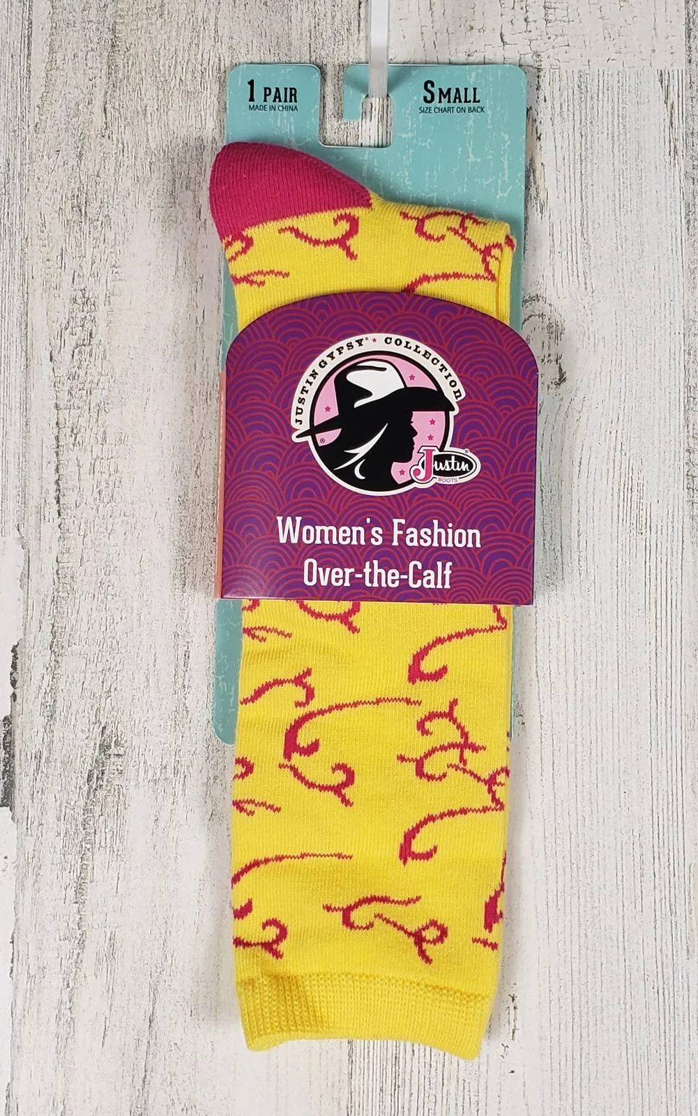 New with tags Yellow & pink Curly Q design Justin across foot Cushioned sole Size small is equivalent to a women's US Shoe size 4-9, please see photos for size chart 73% Cotton 25% polyester 2% spandex 1571