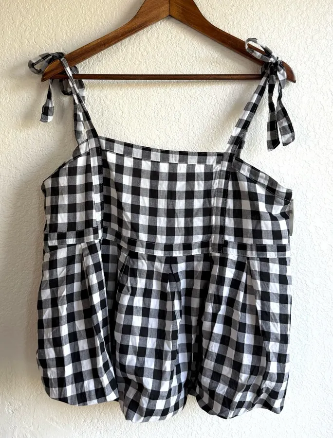 Womens Size Large Shirt Tank Black White Gray Gingham Plaid Toe Straps Bubble Hem Cotton Excellent... Show more