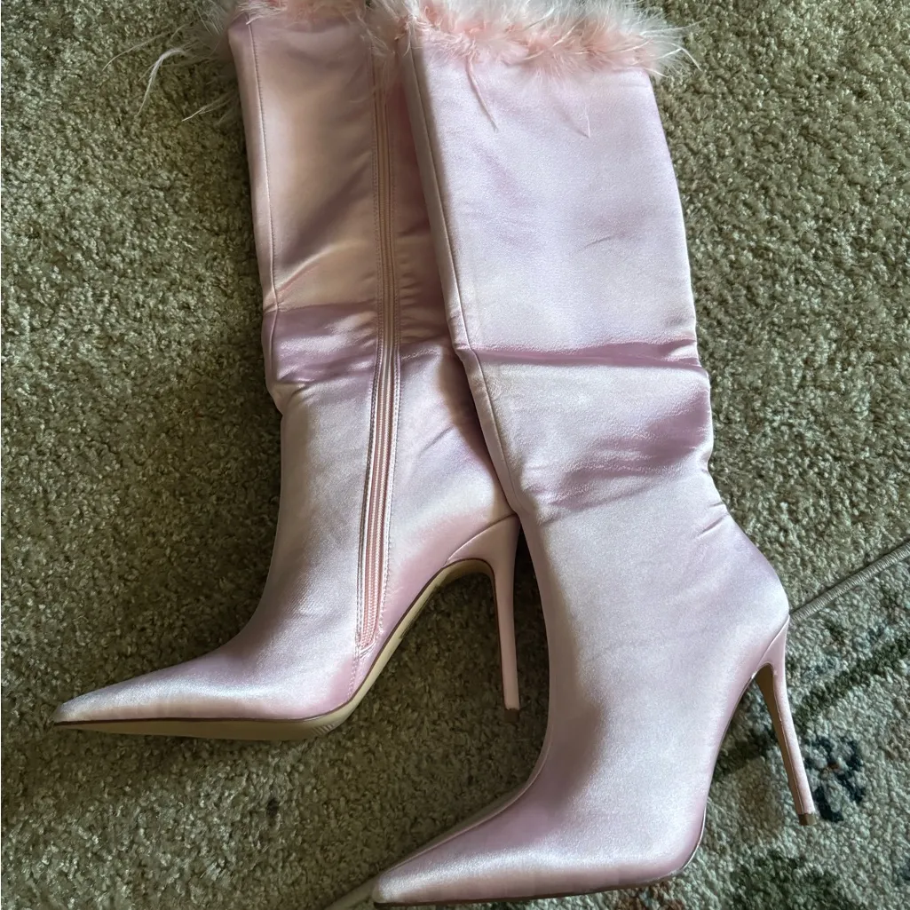 JENSON HEELED BOOTS - PINK KNEE-HIGH SATIN WITH FEATHER TRIM size 5 brand new - never worn before... Show more