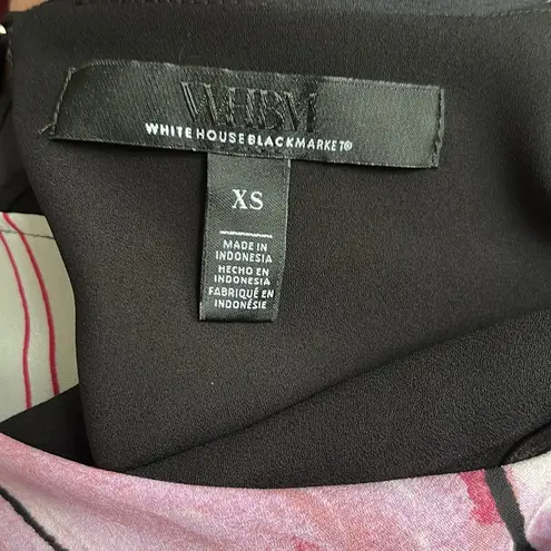 Chic V-neck WHBM tunic with bold floral print in black, pink, blue and lavender hues. 3/4 length bat... Show more