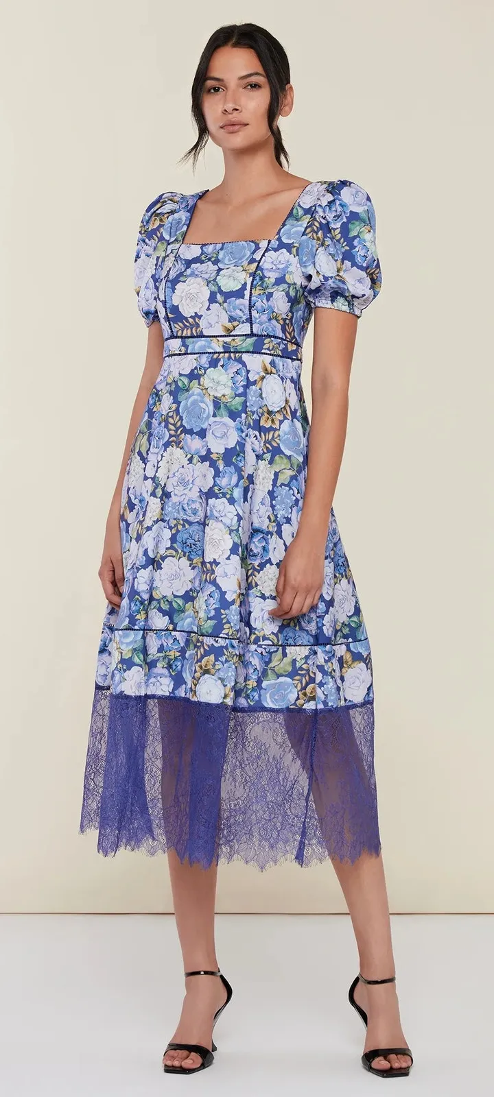 Rachel Parcell Size 8 Blue Floral Puff Sleeve Lace Trim Spring Midi Dress NWT New With Tags Size: 8 Brand: Rachel Parcell Color: Blue Beautiful spring floral print in shades of blu Square neck Puff sleeves Ladder lace trim details along the seams Fitted bodice, flared skirt Flowy silhouette with lace trim Satin chiffon fabric Short sleeves Lace trim detail at hemline Style: Cottagecore, romantic, vintage style, regency, feminine, girly, coquette, romantic Occasion: Wedding guest, garden party, tea party, formal event, special occasion 100% Polyester Measurements: Bust: 17 inches Waist: 14.5 inches Length: 51 inches