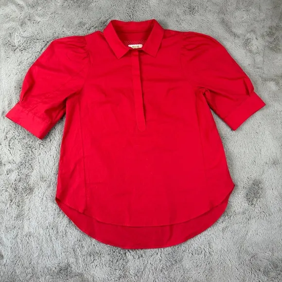 A vibrant statement piece, this red tunic top exudes modern sophistication with a touch of playful charm. The classic collared neckline flows into a relaxed silhouette, enhanced by a concealed half-button placket that adds a sleek, minimalist touch. The standout feature is the stylish puff sleeves, creating a flattering and fashionable look. The high-low hemline adds a contemporary edge, making it versatile enough to pair with various bottoms. This top is perfect for a casual brunch with friends, a stylish office ensemble, or a chic weekend getaway. Color: Red Type: Blouse Department: Women Style: Tunic Material: Cotton, 100% Cotton Neckline: Collared Sleeve Length: Short Sleeve Sleeve Type: Puff Sleeve Accents: Button Pattern: Solid Features: High-Low Hem, Collared, Half Button Placket, Breathable, Casual Fit: Regular Keywords: Maeve, Anthropologie, Tunic Top, Blouse, Red, Puff Sleeve, Collared, High Low Hem, Casual, Contemporary, Womens Fashion, Small, Cotton, Boho
