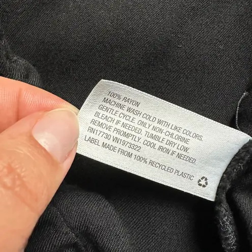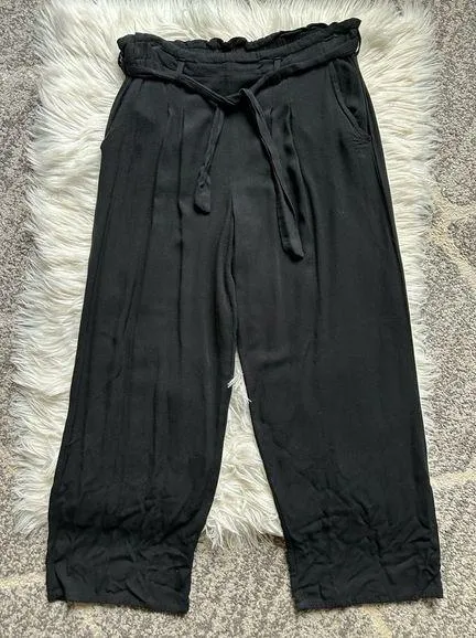in black. Self tie high waist. Cropped length (approx 26”). Stretchy elasticized waistband. 100% ray... Show more