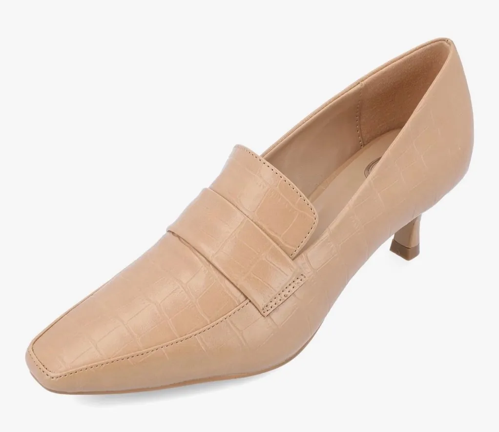 NO BOX Tan Journee Celina Pump Reflect your personality through fashion by flaunting the Celina pump from Journee Collection. This stylish slip-on loafer with embossed vegan synthetic upper, square toe, vamp band and kitten heel is the perfect finish to your tailored look. Item # 545918 UPC # 194593896895 FEATURES Embossed vegan synthetic upper Slip-on Square toe Synthetic lining 4mm Tru Comfort Foam™ insole 2" covered kitten heel Synthetic sole Imported