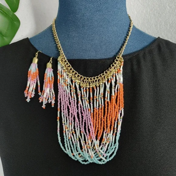 Pretty boho multi strand necklace and earrings set Gold tone chain with multi color beads Measures 21" Bib hangs 4.5" Hook dangle earrings hang 2.5" New #26 Bohemian Gypsy hippie Western Indian bohemian tassel on-trend trendy
