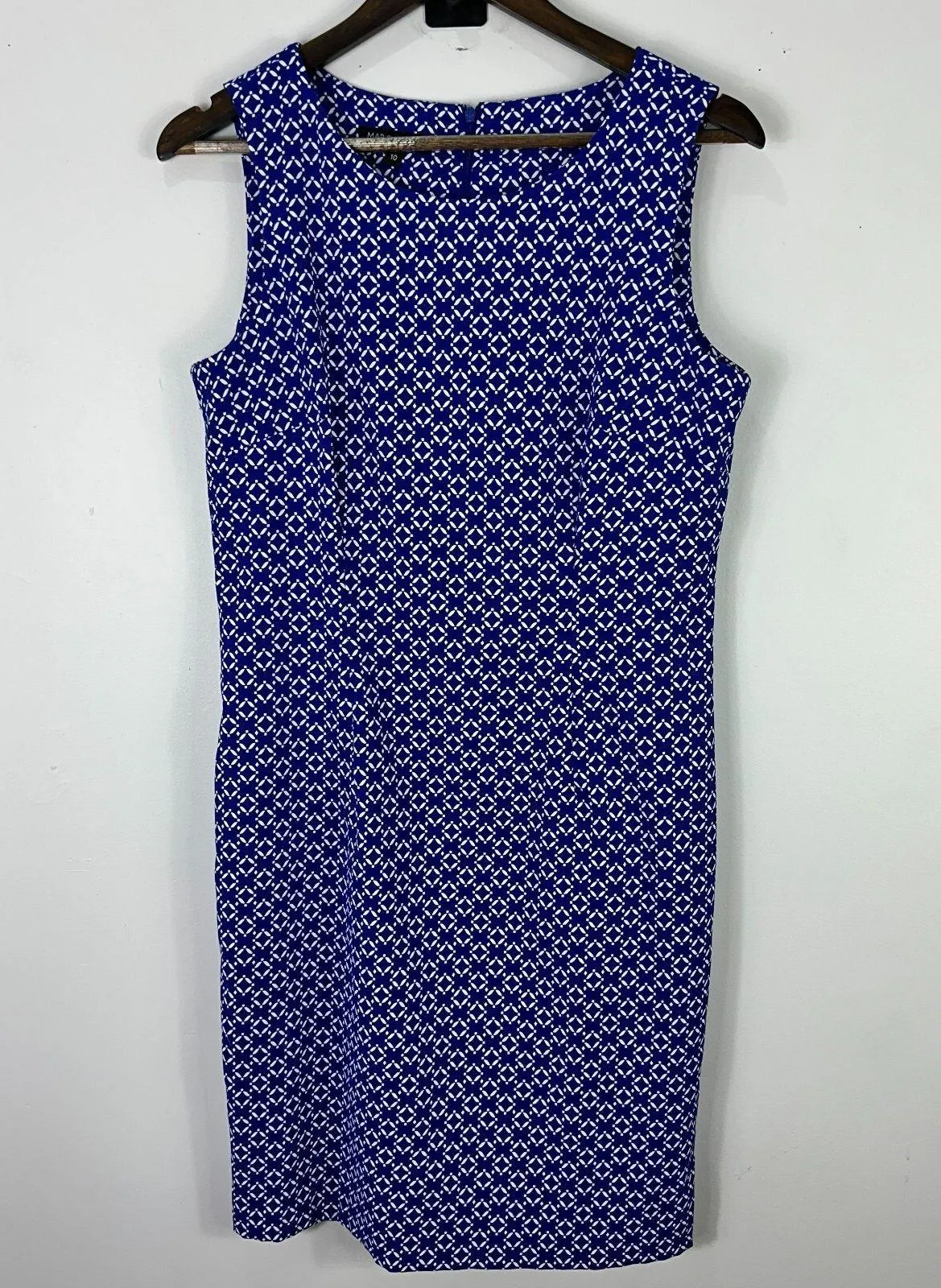 Mario Serrani Dress Women 10 Sleeveless Blue White Sheath Quiet Luxury Preppy Chic and timeless sleeveless sheath dress by Mario Serrani in a vibrant cobalt blue with white geometric print. Features a tailored silhouette, concealed back zipper, and a fully lined interior. A versatile piece perfect for business, brunch, or vacation styling. ---------------------------------------- Old Money, Quiet Luxury, Preppy, Classic Elegance, Summer Office, Country Club, Clean Girl, Minimalist Style, European Inspired ---------------------------------------- Condition: Excellent pre-owned condition with no flaws. ---------------------------------------- Measurements: * Length: 33" * Pit to Pit: 18.5" * Waist (approx): 17.5" ---------------------------------------- Fabric / Made in: 97% Polyester, 3% Spandex Lined
