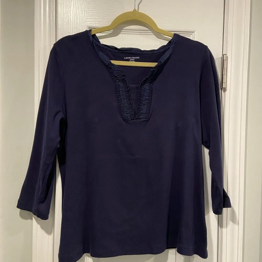 Laura Scott Size LP Navy Blue 3/4 Sleeve V Neck Top Satib Embroidered Trim - $17 - From Lindsey