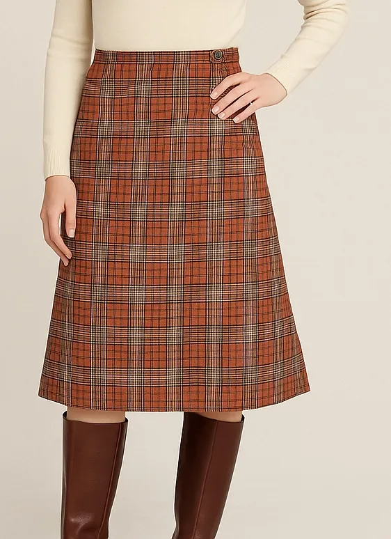 Vintage Pendleton 100% virgin wool plaid A-line skirt in orange and brown tones. Made in USA, fully lined, timeless fall classic. This vintage Pendleton wool skirt features a warm plaid pattern in burnt orange, brown, and ivory with subtle glen check detailing. Expertly tailored from 100% virgin wool and fully lined for comfort, it offers the perfect blend of structure and softness. The knee-length A-line silhouette gives a flattering drape and versatile styling for fall and winter. Autumn Glen Plaid. A-line silhouette. Knee / mid-length. Back zip and button closure. No stretch. Vintage size tag: 16 (fits modern size ~10, see measurements). 100% Virgin Wool. Acetate lining. Dry clean. Excellent vintage condition. Modeled photo is AI-generated. BRAND: Pendleton SIZE: tagged 16 (fits modern size 10) COLOR: Orange / Brown / Ivory plaid WAIST: 15” HIPS: 21” LENGTH: 26.5” CONDITION: previously owned ORIGIN: USA Marked sizes will vary by designer • All measurements are approximate and taken flat in inches • Color may vary on your screen. •Fast Shipping •Small Business •Carefully Packaged, Smoke-Free •5-Star Seller Perfect for fall and winter outfits — pair with turtlenecks, tall boots, and a wool blazer for a classic heritage look. Ideal for workwear, vintage collections, or cozy seasonal wear.