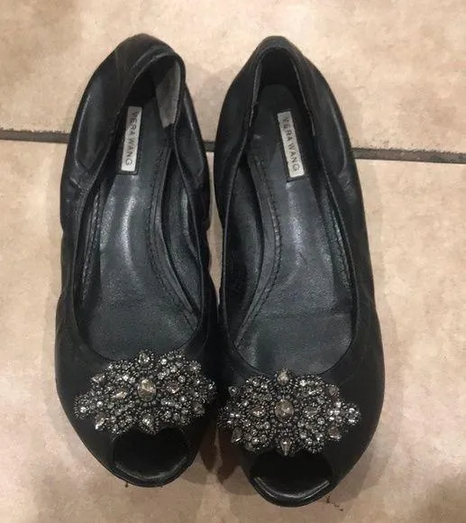 Vera Wang Black Leather Peep Toe Jeweled Flats Size 6 - $45 - From Tara