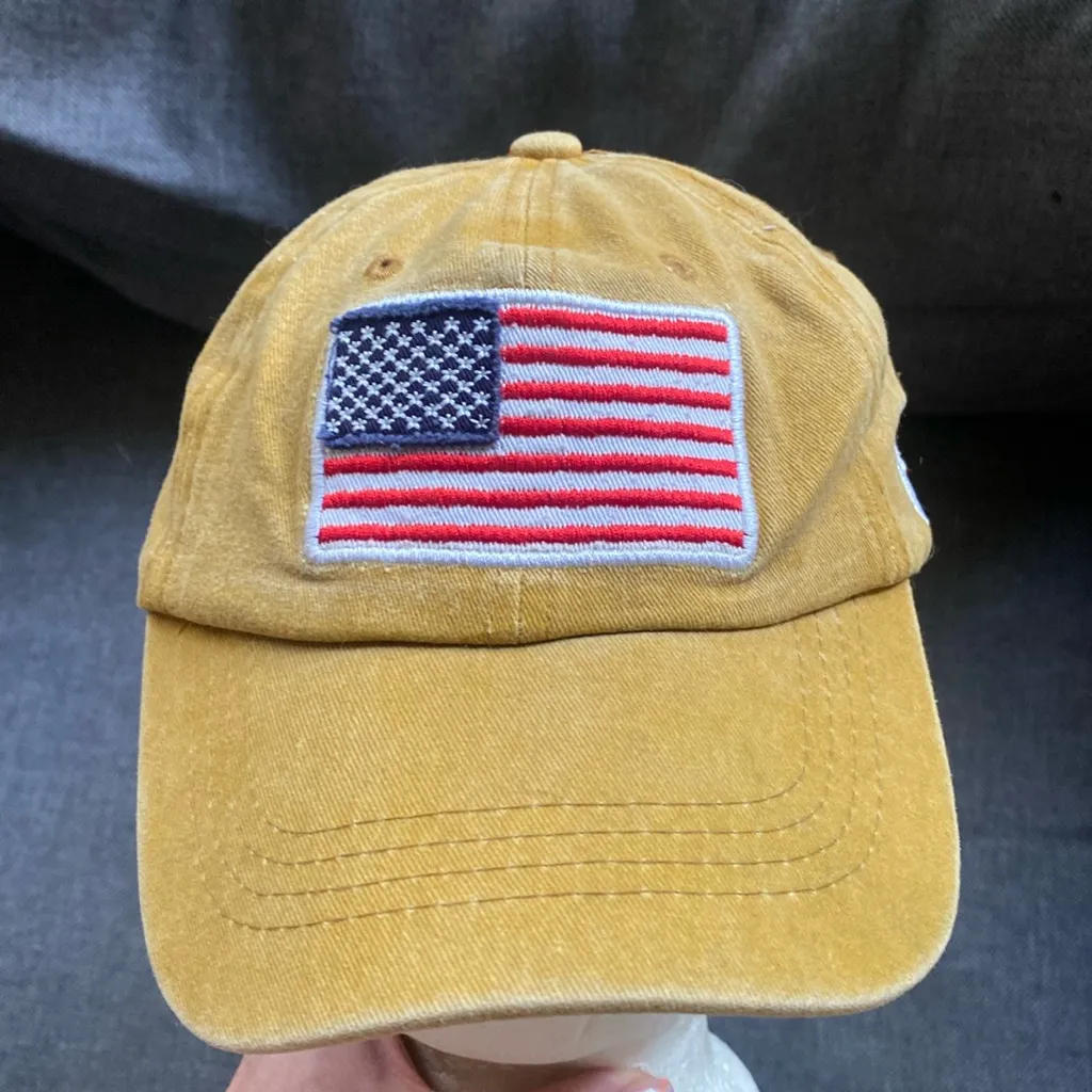 EUC American Flag patch canvas baseball hat. Mustard yellow 100% cotton hat with American flag patch on front, USA monogram on side, America embroidered spell out on side. Worn in, distressed look. Super cute for summer and 4th of July! From a smoke and dog-free home.
