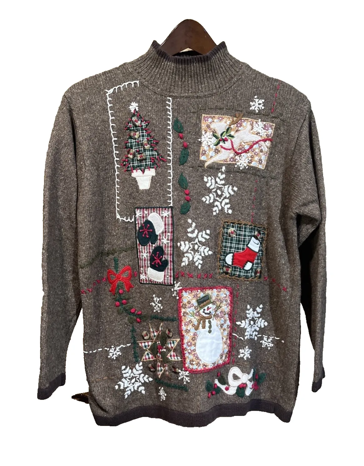 Heathered brown color. Beautiful embroidery detail. Patchwork design. Mock turtleneck 55% Ramie 15% Wool 15% Acrylic 15% Nylon Hand wash Excellent preowned condition. No flaws, holes or stains. Measurements are approximate Chest 40 inches Length 25 inches Sleeve length from the neckline 25 inches