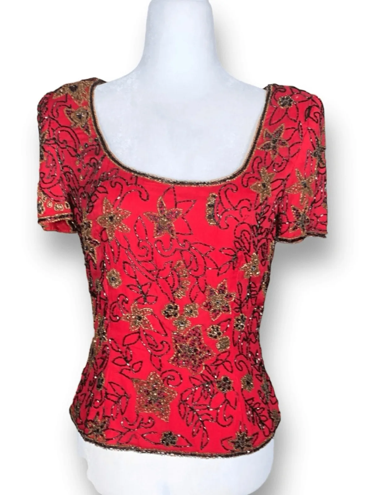 Vintage Papell Boutique Evening Shirt Size Small Luxurious red silk top Delicate seed bead embellishments Shades of black and metallic gold Timeless floral design Deep scoop neck Short sleeves Some loose threads Lined Made of 100% silk Flat lay measurements 12 inches pit to pit 21 inch length Style Tags Cocktail Party Evening Wear Holiday Festive Special Occasion Elegant Wedding Guest Formal This classic piece is perfect for formal events black tie prom cruises cocktail party Valentines