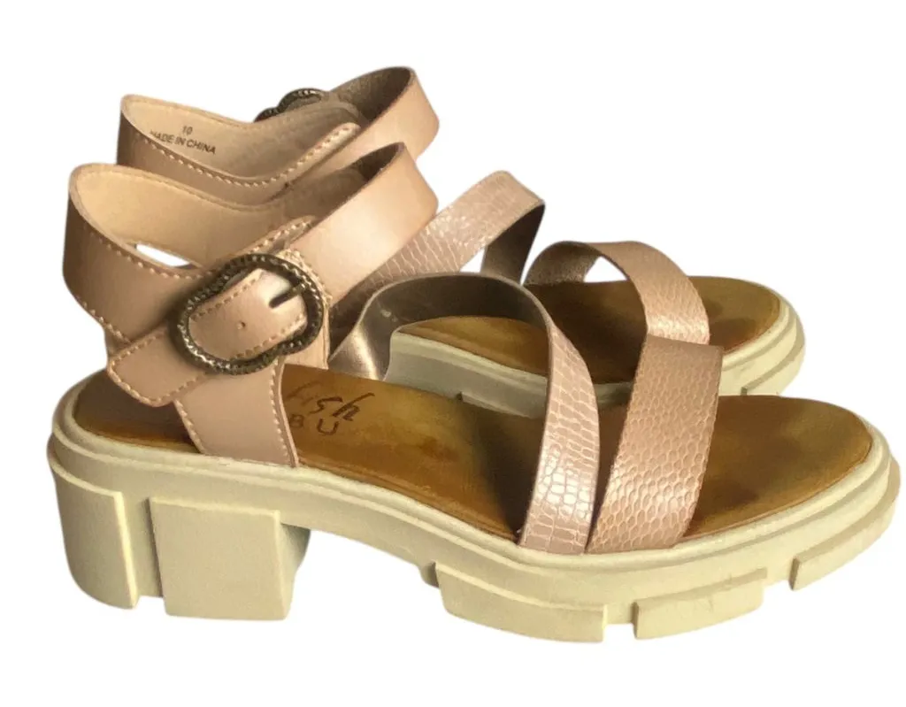 In Good Pre-Owned Condition light markings Women's size 10 Color: Cashew Dile/ beige, brown cream Block Heel ankle strap with buckle detail Tags: wedding guest, chunky, boho, hippie, vacation, event