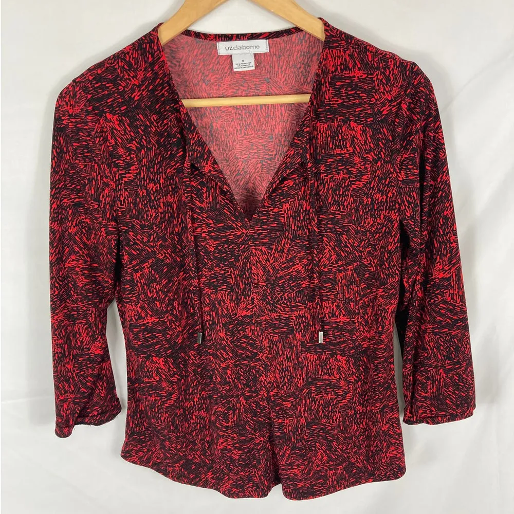 Liz Claiborne V Neck Blouse Size Small red and black 3/4 sleeve great shape
