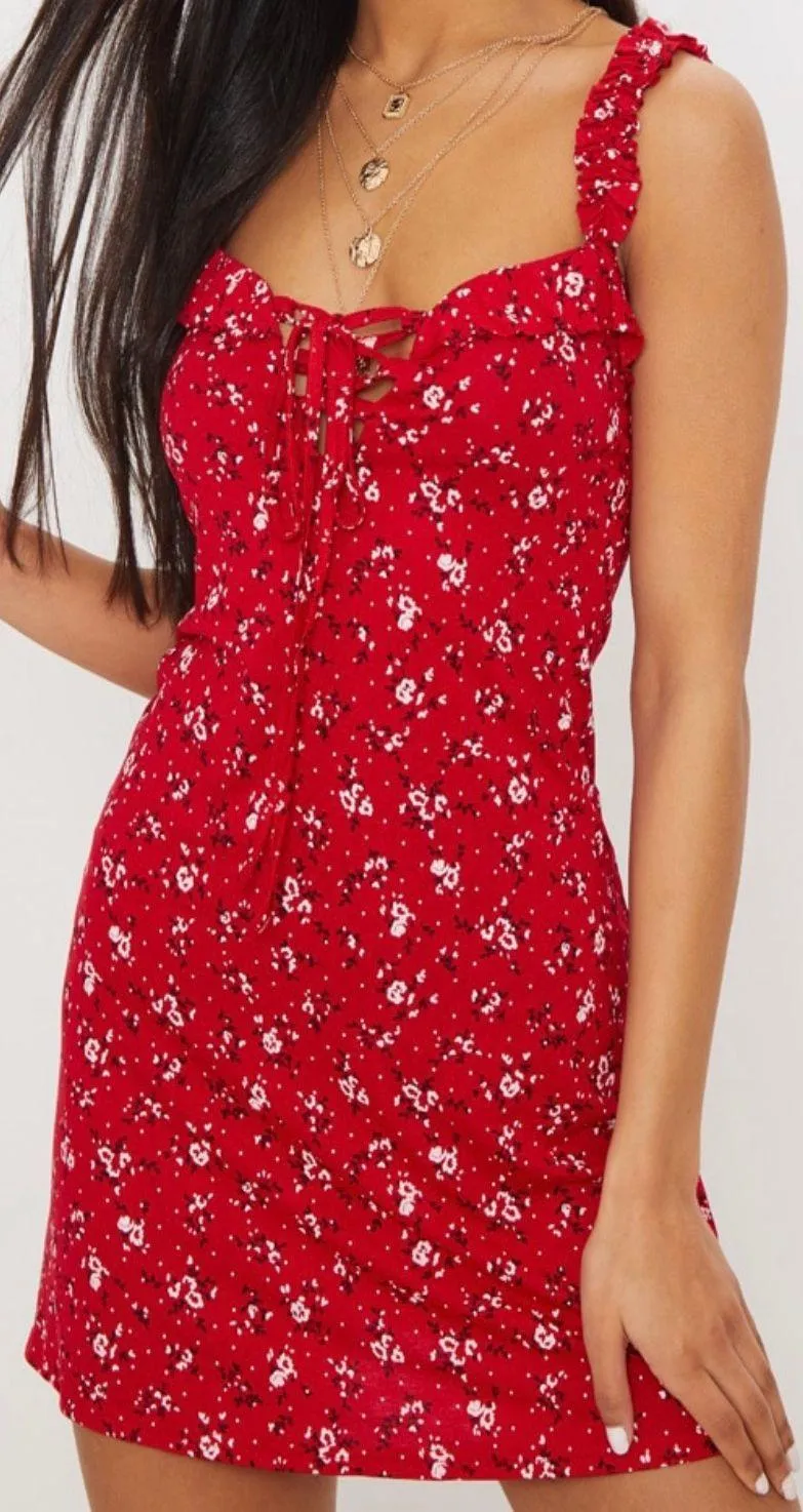 In exceptional condition worn once and is so dainty for summer time. A red floral print fabric with... Show more