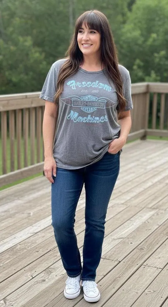 Embrace your adventurous spirit with the Women's Harley-Davidson Gray Blue Freedom Machines Short Sleeve Tee. This stylish tee embodies the freedom of the open road, perfect for any motorcycle enthusiast or casual day out. Made from high-quality, breathable cotton, it ensures comfort throughout your day, whether you’re riding or relaxing. The vibrant graphic design captures the essence of Harley-Davidson, making it a standout piece in your wardrobe. With its relaxed fit and short sleeves, this tee is ideal for layering or wearing alone. Get ready to turn heads and express your love for freedom with this iconic apparel. Don’t miss out on adding this timeless piece to your collection—grab yours today and ride in style! - 100% Cotton fabric - Short sleeve design - Relaxed fit style - Vibrant graphic print - Machine washable care #HarleyDavidson #MotorcycleApparel #FreedomMachines #CasualStyle #WomenTees