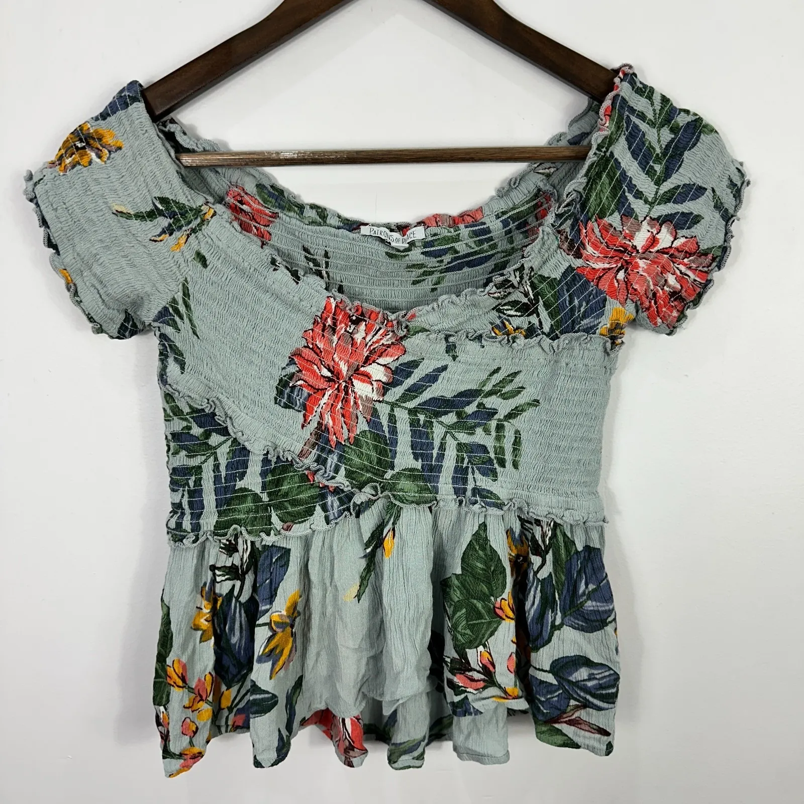 Patrons of Peace women's size small smocked peplum top featuring a soft blue floral print with tropical blooms in red, yellow, and green tones. Made in India from lightweight 100% rayon with elastic shirring, frayed raw-edge trim, and a flared hem for a romantic, boho-inspired silhouette. Perfect for spring and summer, pairs beautifully with denim shorts or maxi skirts. Features: * Size S (see measurements for best fit) * 100% Rayon * Smocked bodice, peplum hem * Made in India, RN 74786 * Style #J1094F01 * Floral boho cottagecore style * boho, cottagecore, peasant, floral, garden party, romantic, soft girl, festival, summer, tropical, hippie, coastal, indie #BohoStyle #Cottagecore #FestivalFashion #FloralTop #SummerOutfit