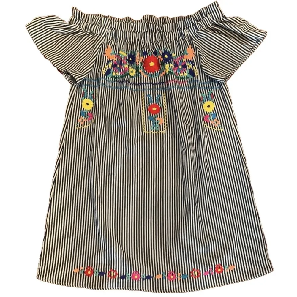 This off-the-shoulder, blue and white striped, very soft denim with embroidered flowers is ready for... Show more