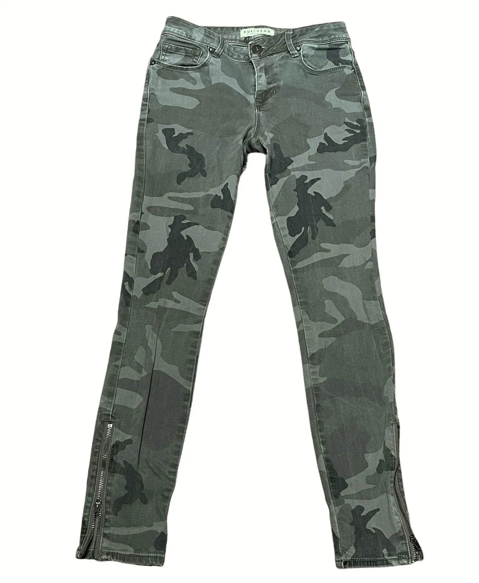 In excellent condition. Green camouflage. 5 pockets with buttoned zip fly closure. Zippered ankles.... Show more