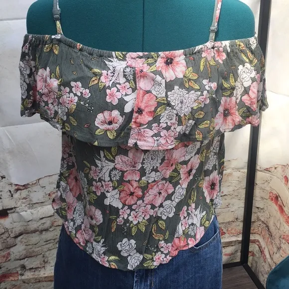 Excellent preloved condition - Billabong Off-The-Shoulder Cold Shoulder Ruffle Neckline Floral Print... Show more