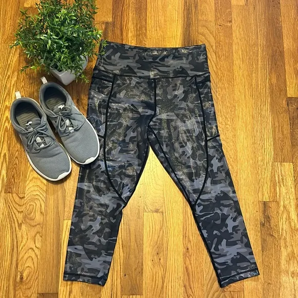 Zyia Active Gray Charcoal Shiny Camo Camouflage Athletic Leggings Pockets. Material has a shiny/sheen to it. 2 side pockets. In used condition with no call outs. Zyia Active Size 8/10 73%polyester 27%spandex 8oz K