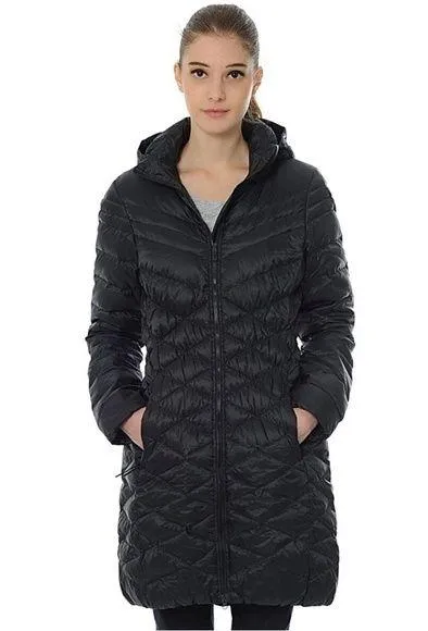 Stay warm and stylish with this black quilted hooded coat. Perfect for chilly days, it has an attach... Show more