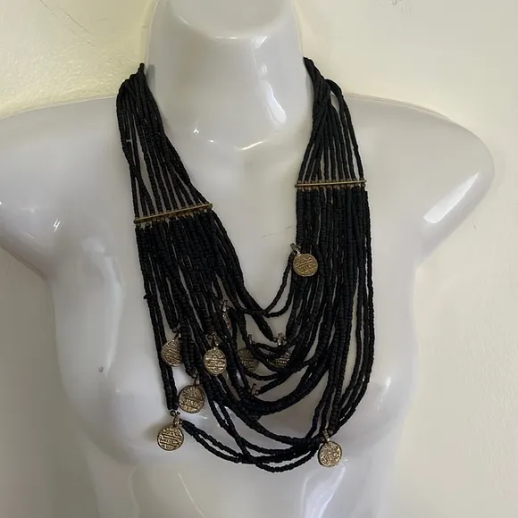 Artist made multi strand statement necklace. Beads with metal coins. Very special piece. Also available in lighter color.. See other listing. African tribal fashionable ethnic culture Indian elegant belly dance dancing J1