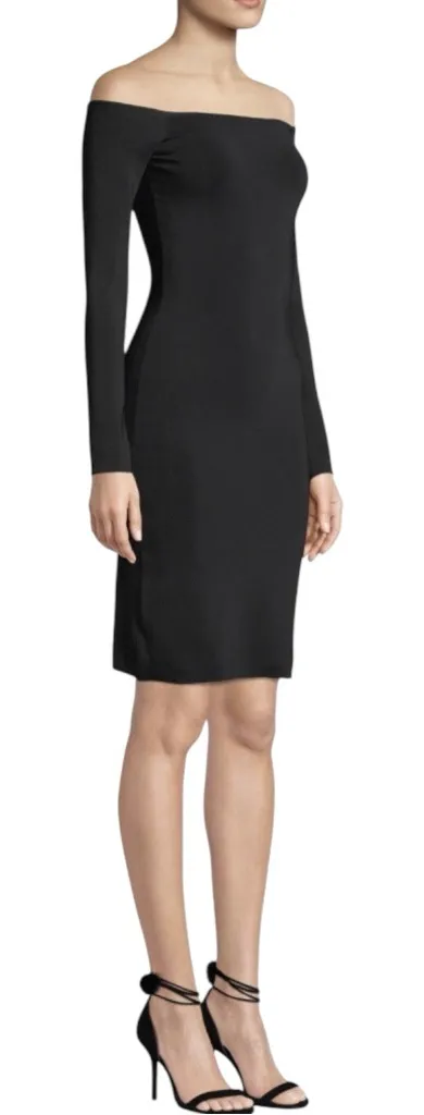 Elizabeth and James Omorose dress in black. Off-the-shoulder neckline. Long sleeves. Body-conscious silhouette. Knee length. 76% viscose, 22% nylon, 2% spandex Size Small Never worn with original tag still attached. See pics!