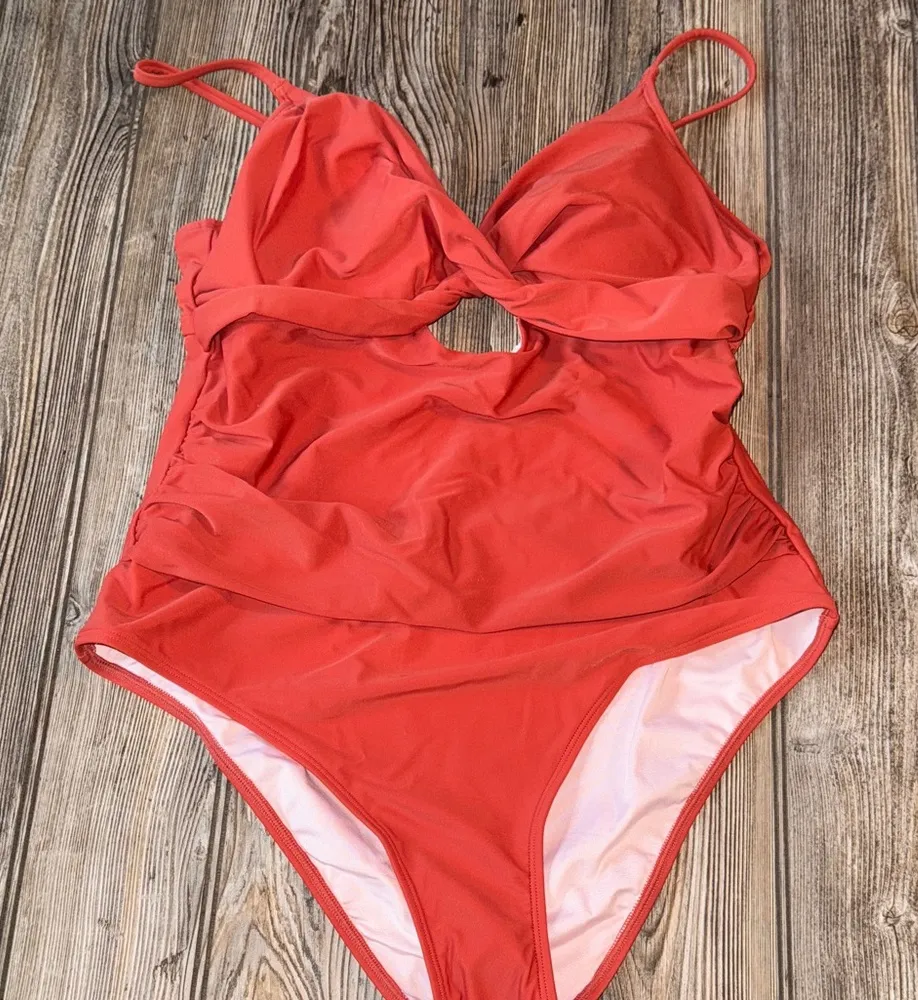Stylish orange one-piece swimsuit with a front cut-out design. Perfect for beach days. Adjustable st... Show more