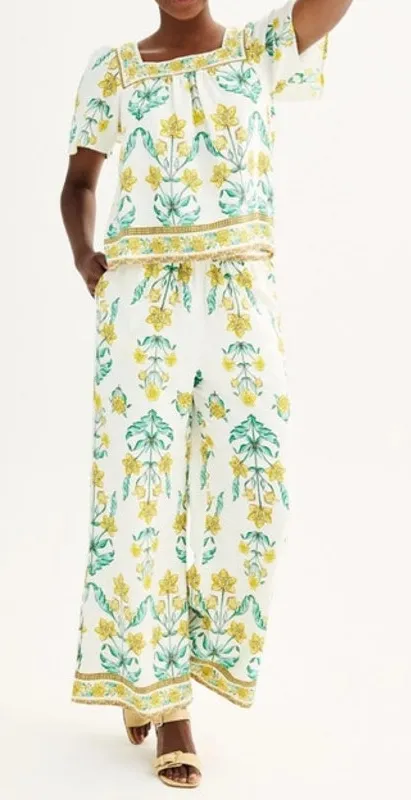 Draper James linen-rayon blend pants with yellow floral print and green stems. Elastic waistband wit... Show more