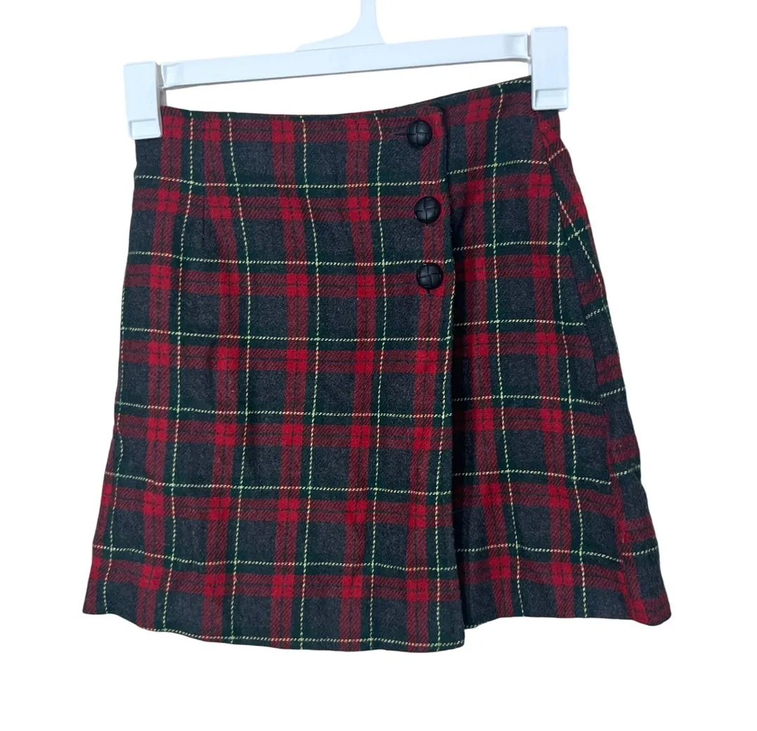 Classic plaid mini skirt from A. Byer California in a vintage style. Featuring a stylish red, green, and grey plaid pattern, this skirt is designed with a button front closure. The overlapping front panel adds a unique twist to the traditional mini skirt silhouette. Type: Skirt Style: Mini Skirt Length: Short Department: Women Pattern: Plaid Material: Acrylic, Wool, Polyester Accents: Button, unlined Fabric Type: Tweed Features: All Seasons Theme: 90s, Preppy Closure: Button Rise: Mid Occasion: Casual Keywords: plaid, vintage, 90s, retro, preppy, schoolgirl, holidays !!!Please See Measurements vintage sizes run smaller than modern sizes!!! Measurements Length: 16 1/2 inches Waist: 13 inches