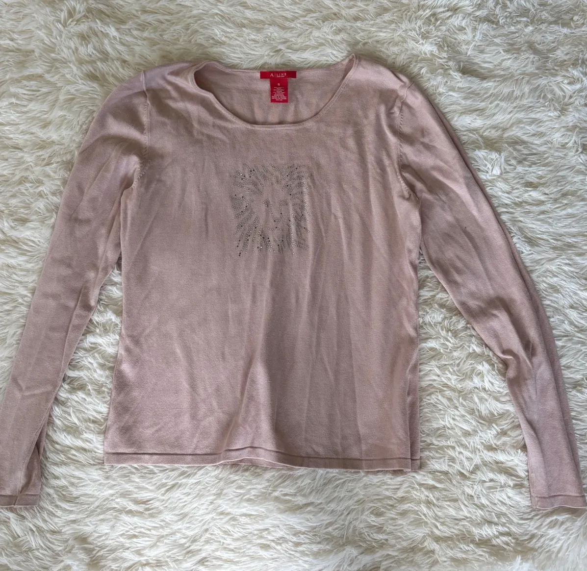 Keywords: A Line Anne Klein, Knit Top, Long Sleeve, Rhinestone, Lion Design, Blush Pink, Silk Blend Top, Designer Top, Small, Scoop Neck, Elegant Top, Evening Top, Casual Top