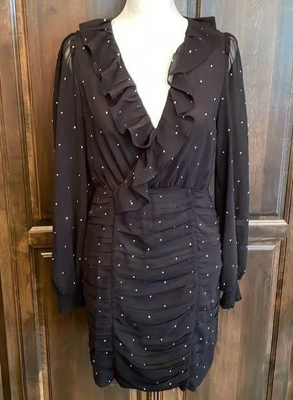 Showstopper! Gorgeous black mini dress with ruffle accents. Silver studs. Ruffle neckline. Sheer sleeves. Fully lined elsewhere. New with tags! Pit to pit 18”, waist 13”, length 33”
