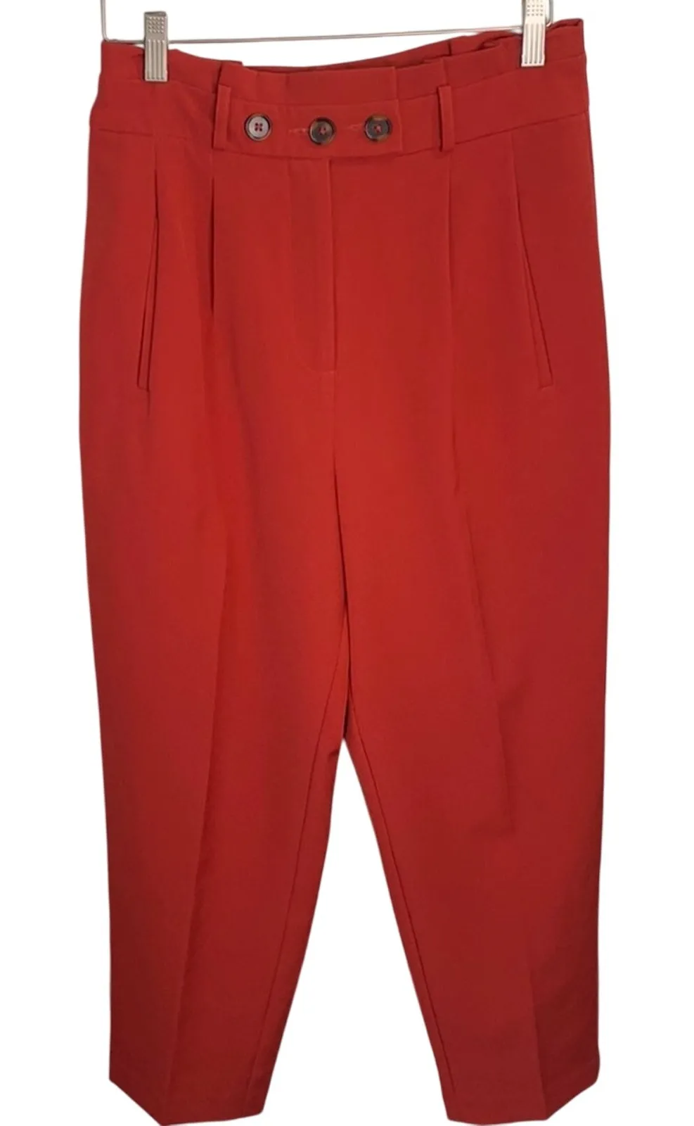 Chic and unique women’s pants in a lovely shade of tomato orange-red. Front zip and 3 tortoise button enclosure, dual slide front pockets, rear decorative right pocket, flattering gathered waist. Comprised of 94% polyester 6% spandex Very good condition! Across waistband unstretched approximately 14-1/2”. Inseam approximately 26”. Front rise approximately 13”. W-215