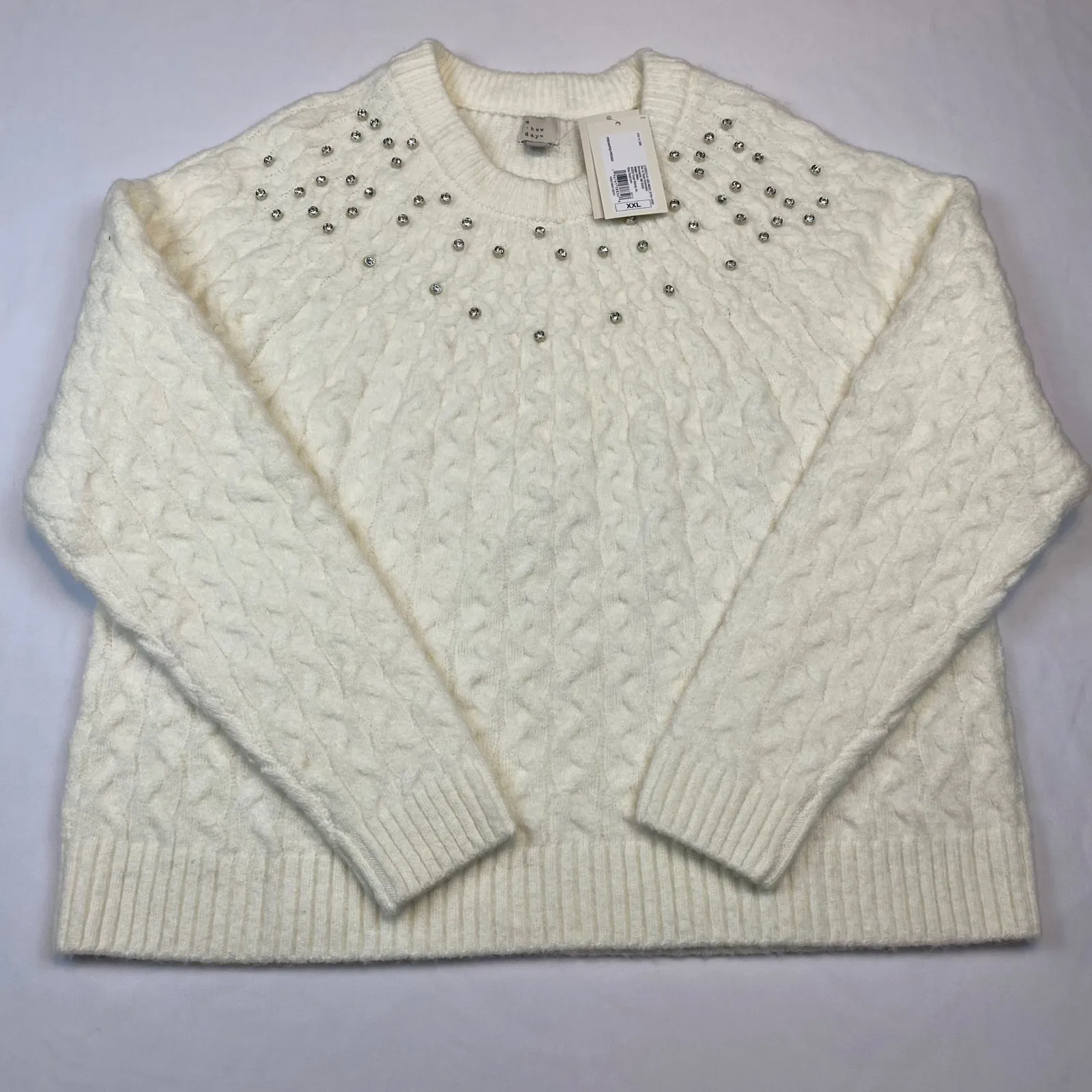 A cream cable knit sweater with rhinestone embellishments. This pullover features a crew neckline an... Show more