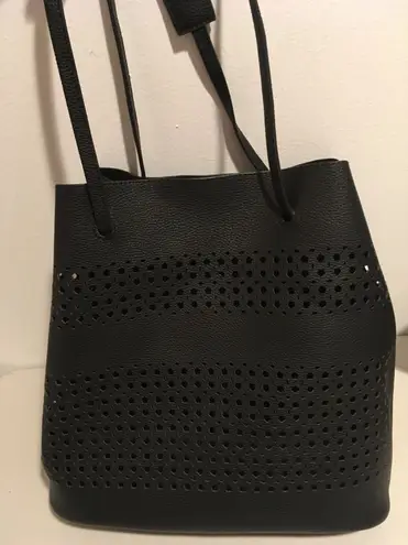 Black Laser Cut Bucket Tote with detachable wallet. Measures 13 1/2” x 5 1/2” x 12 1/2”.