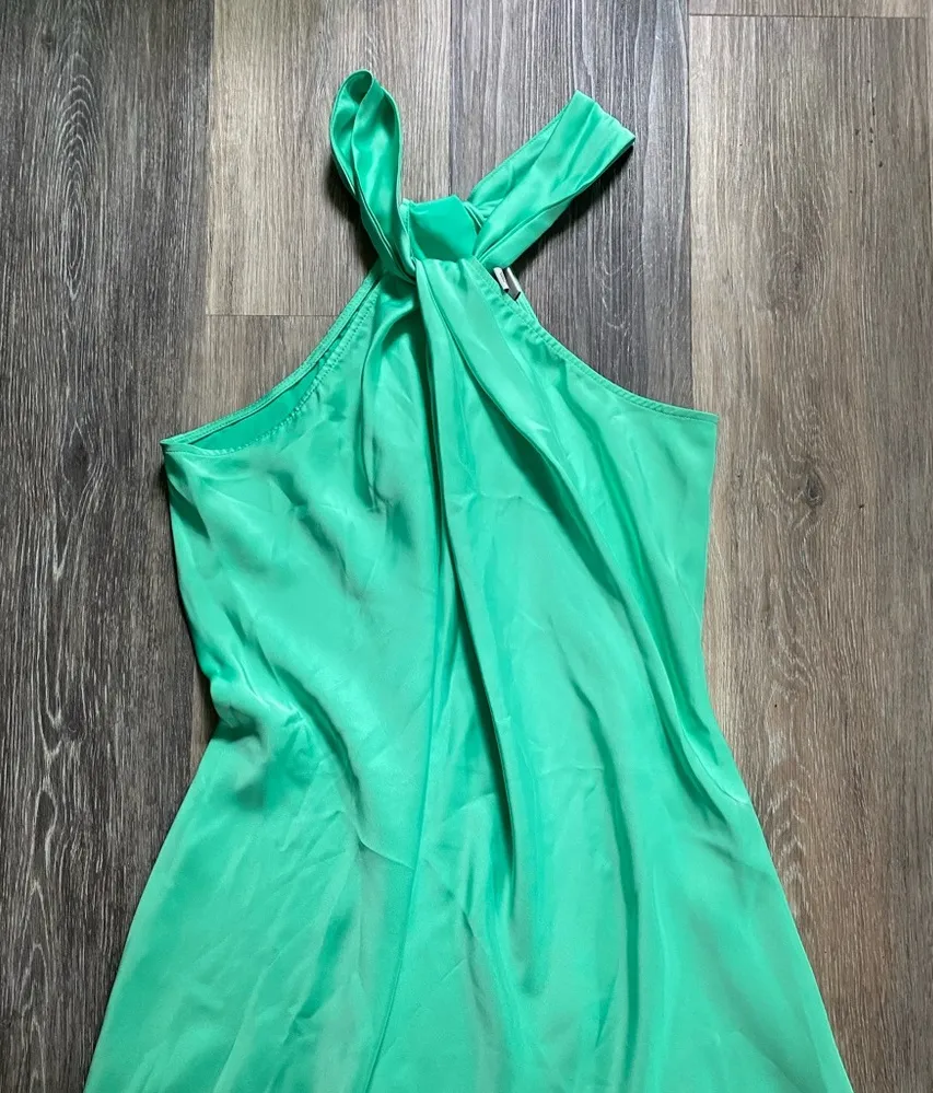 Effortlessly chic and flattering, this silky green sleeveless halter midi slip dress features a knot... Show more