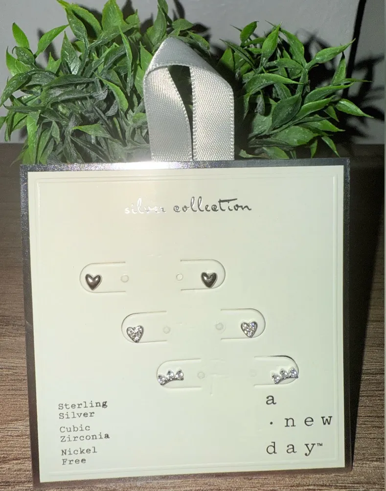 Charming silver earrings set by A New Day. Features heart and bow designs. Perfect for adding elegan... Show more