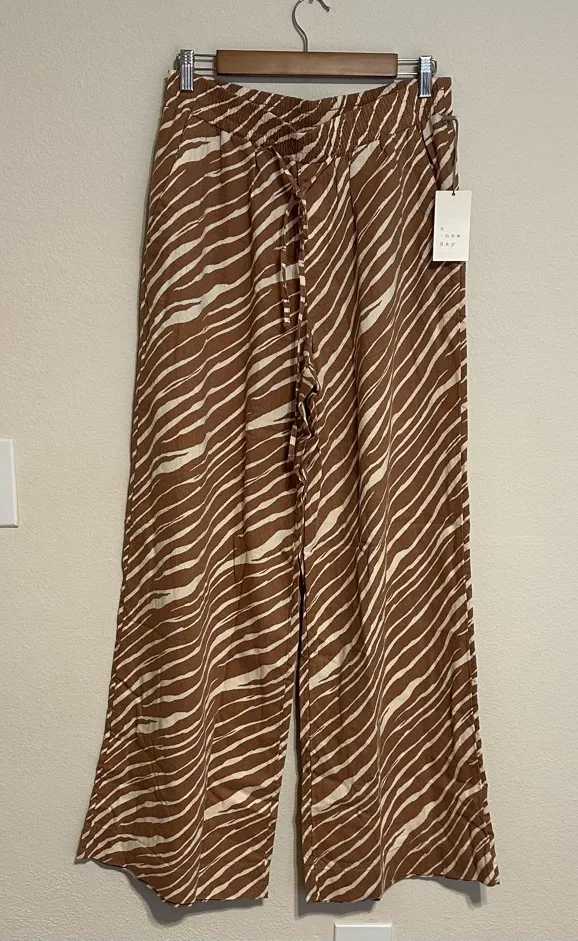 Chic pants wide leg with tan and cream stripes. Features a stylish tie accent. Perfect for any occas... Show more
