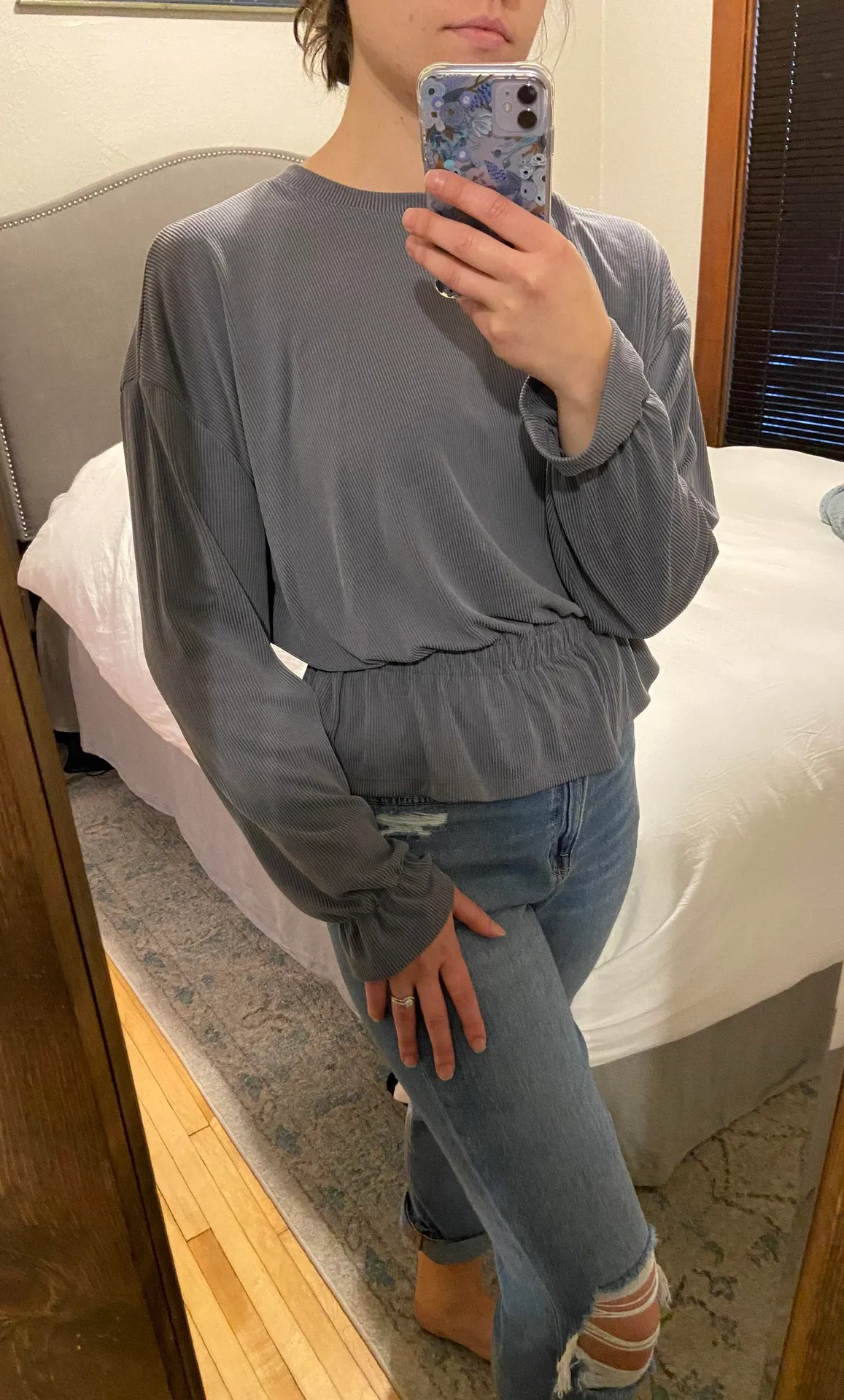 Cute long sleeved top with peplum waist and wrist cuffs perfect for lounging or dressing up! Never w... Show more