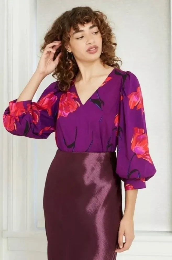 A new day Voile Purple & Pink Floral 3/4 Puff Sleeve Top 3/4 balloon sleeves V neckline Floral print... Show more