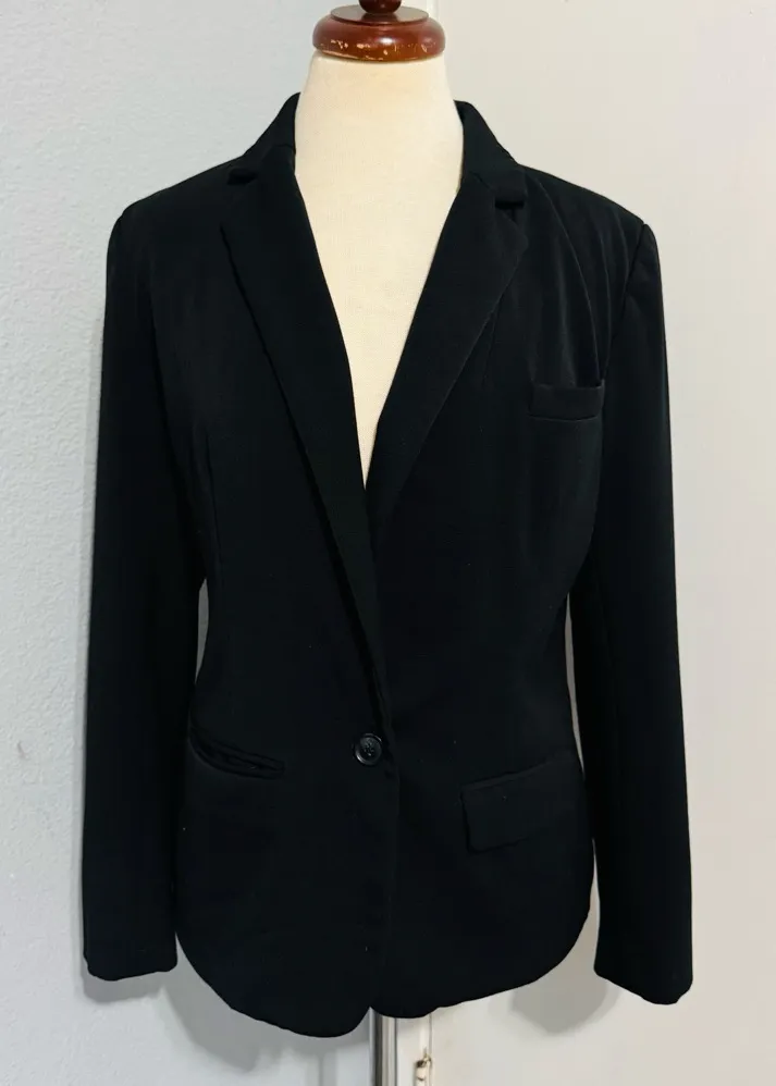 Elevate your style with this classic black blazer. Perfect for any occasion, this jacket offers a sl... Show more