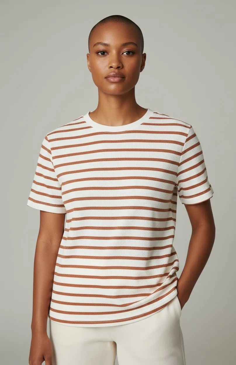 Cozy comfort meets effortless style in this striped tee. Picture yourself wrapped in the soft embrac... Show more