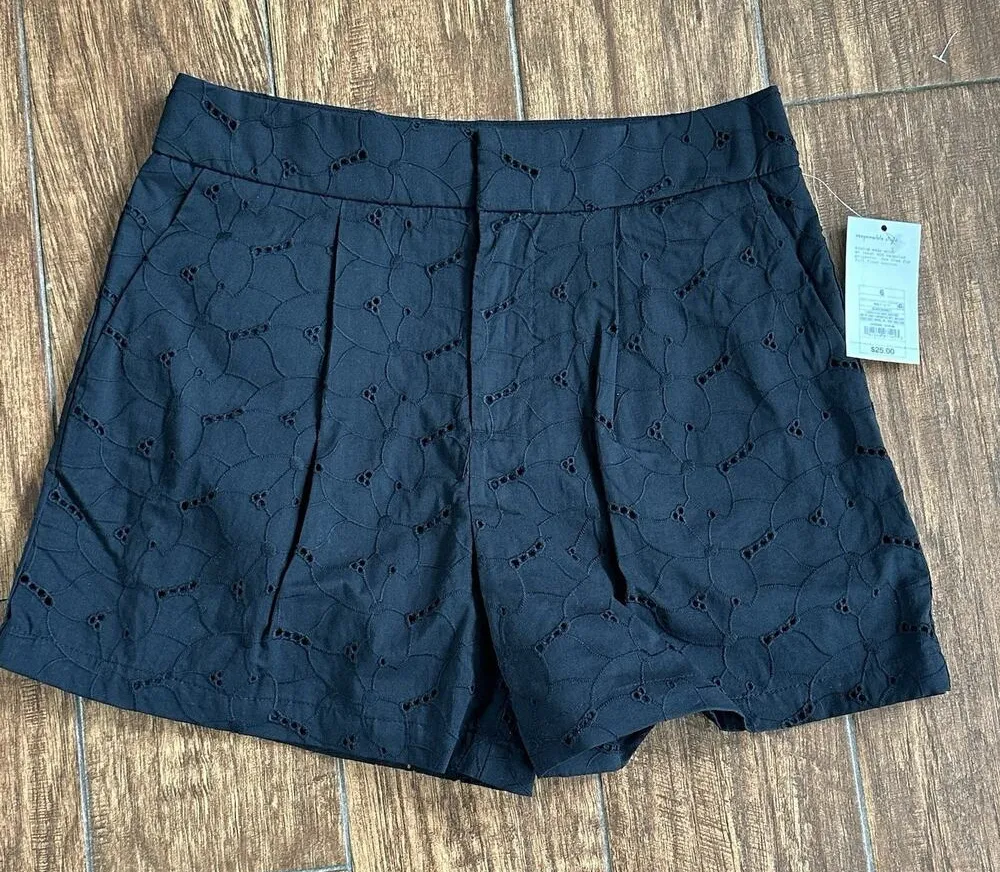 Chic black eyelet shorts with pleated front and side pockets. Fully lined, high-rise fit—perfect sum... Show more