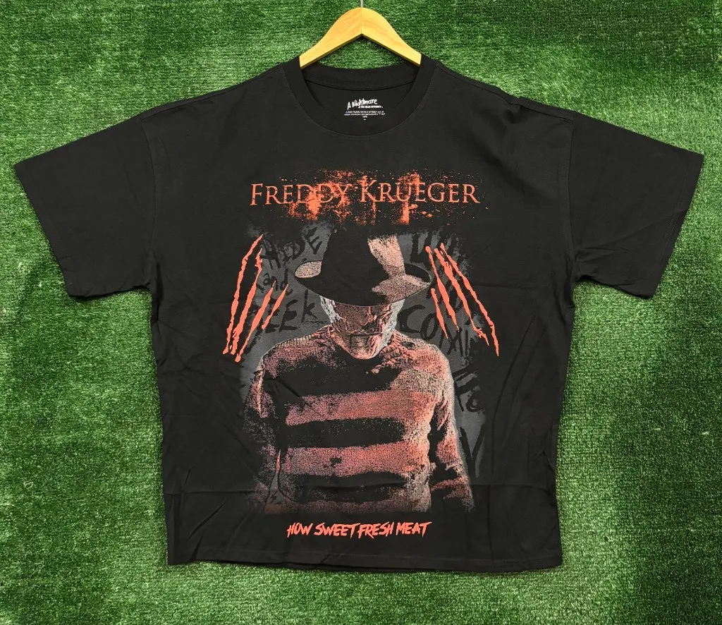 A Nightmare on Elm Street How Sweet Fresh Meat Oversized T-Shirt Extra Large measures 28 inches pit to pit 29 inches long Amazing shirt with graphics on both sides of the t-shirt perfect for A Nightmare on Elm Street fans New overstock in great condition